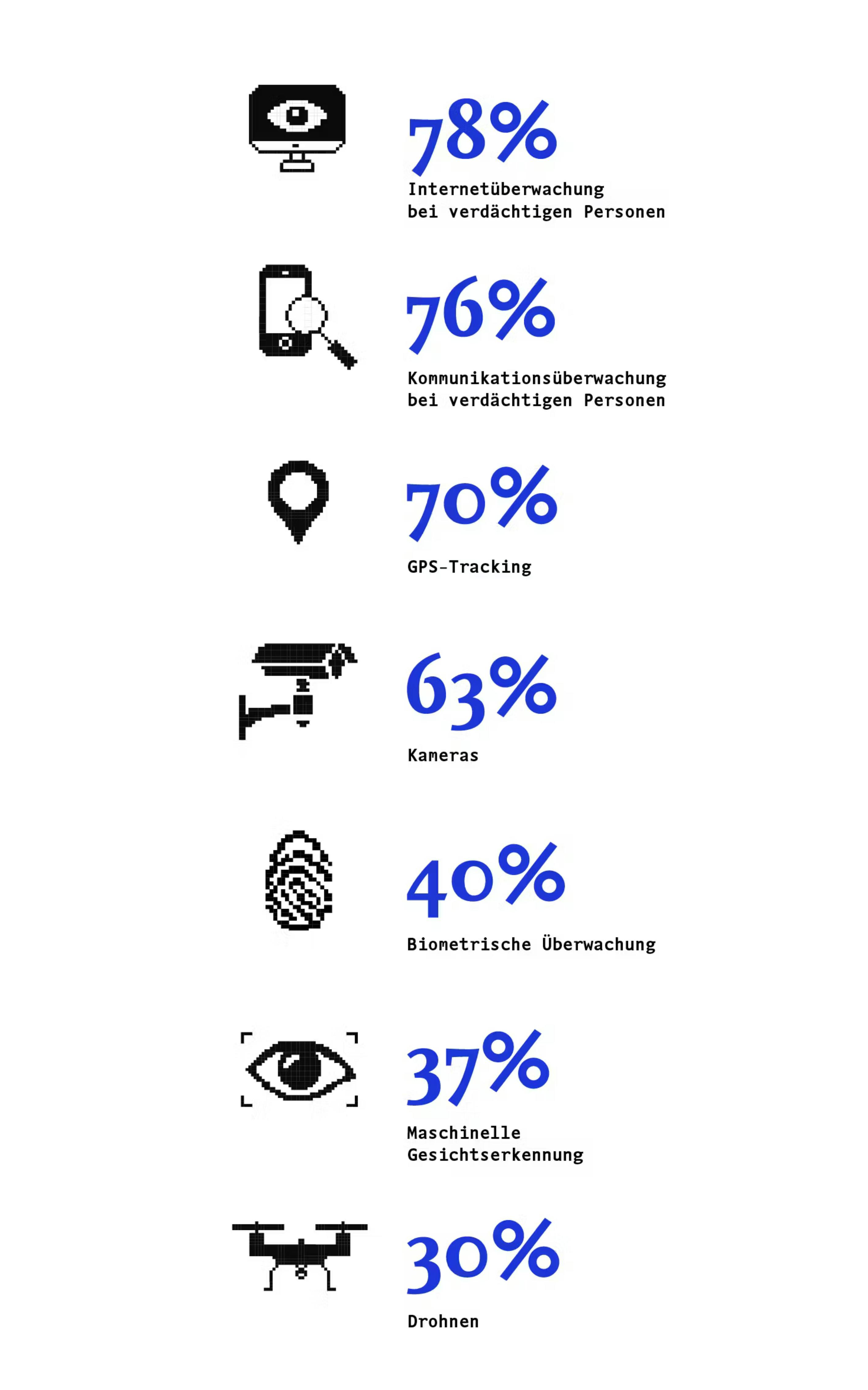 Überwachungstechnologien, die vom Staat im öffentlichen Raum eingesetzt werden, haben wichtige Vorteile: Sie können zum Beispiel Kriminalität reduzieren und die öffentliche Sicherheit erhöhen, indem sie potenzielle Bedrohungen frühzeitig erkennen oder Strafverfolgungsbehörden bei der Aufklärung von Verbrechen unterstützen. Im Verkehrswesen oder bei der Stadtplanung tragen sie zu Lebensqualität, Ressourceneffizienz und Umweltschutz bei, indem sie beispielsweise Mobilitätsströme lenken. Die zunehmende Sammlung und Analyse von Überwachungsdaten durch staatliche Organe wirft jedoch auch Fragen auf, beispielsweise wenn es um Persönlichkeitsschutz und Datenmissbrauch, KI-basierte Diskriminierung oder den Schutz von Freiheitsrechten und Privatsphäre geht. Wie sieht das die Schweizer Bevölkerung? Der Einsatz von Überwachungstechnologien im öffentlichen Raum findet generell breite Zustimmung. Am deutlichsten zeigt sich das bei der Kommunikations- und Internetüberwachung verdächtiger Personen: Rund drei Viertel der Befragten befürworten diese Formen der Überwachung. Der Einsatz von Kameras und GPS-Tracking wird ebenfalls von einer Mehrheit befürwortet, allerdings etwas weniger stark. Ein möglicher Grund für die weit verbreitete Zustimmung könnte ein gestiegenes allgemeines Sicherheitsbedürfnis der Schweizer Bevölkerung im Kontext der unsicheren weltpolitischen Lage sein: Gemäss der Sicherheitsstudie der ETH Zürich (Szvircsev et al. 2024) schätzt diese nur gerade eine von fünf Personen (18%) optimistisch ein. Von einer Mehrheit deutlich abgelehnt werden hingegen maschinelle Gesichtserkennung und biometrische Überwachung. Solche, teilweise KI-basierten, Überwachungstechnologien bergen erhebliche gesellschaftliche und soziale Risiken. Dementsprechend streng sind sie im EU-Gesetz zur künstlichen Intelligenz, dem weltweit ersten umfassenden KI-Gesetz, reguliert. Die Schweiz will mit Regulierungsansätzen Ende 2024 nachziehen (s. Kapitel 3 «Künstliche Intelligenz»). Die Debatten dazu sind in vollem Gange.