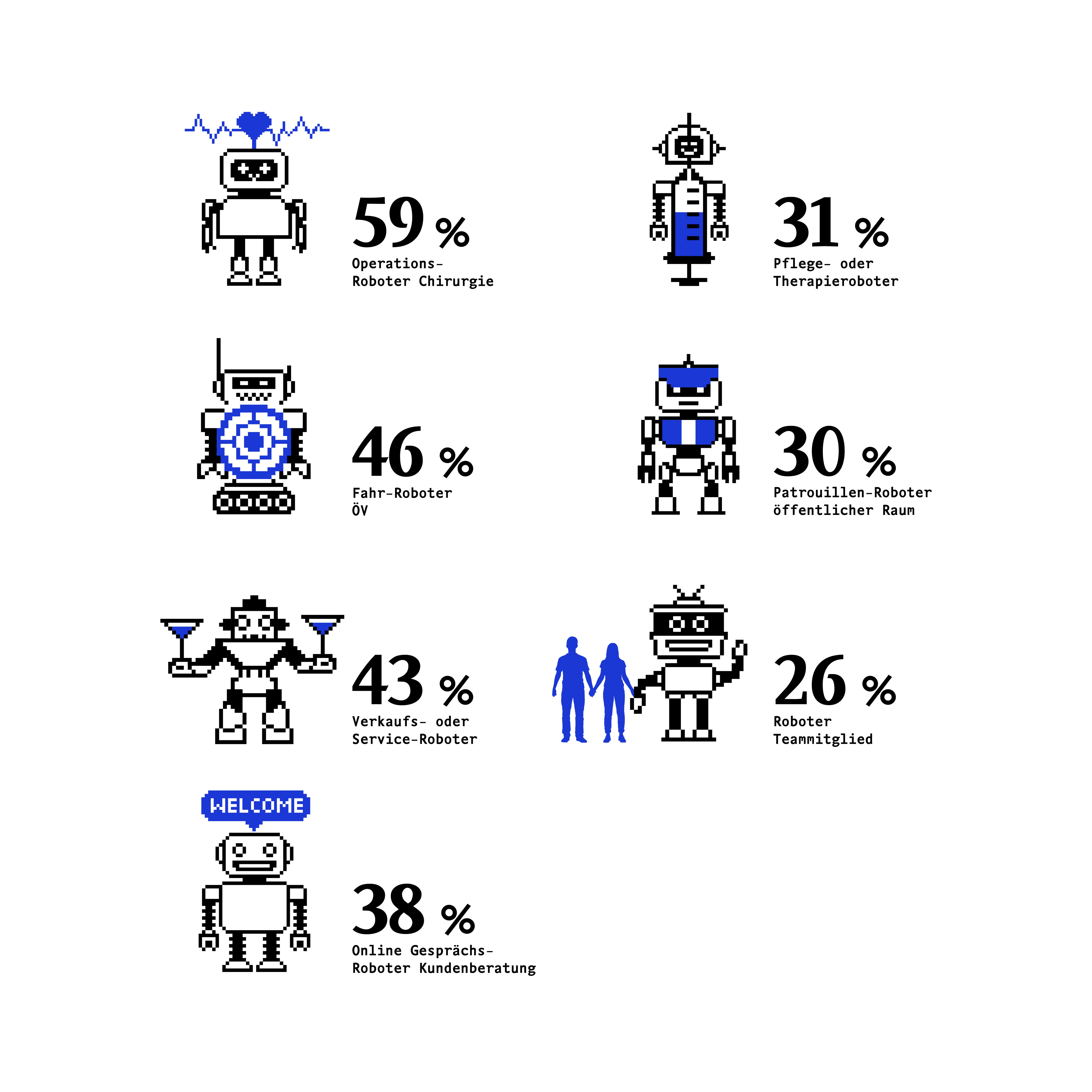 Auf diesen Erkenntnissen bauen wir in der aktuellen Ausgabe auf und wollten genauer wissen: Wie offen ist die Schweizer Bevölkerung gegenüber dem Einsatz von Robotern in verschiedenen Arbeitskontexten?