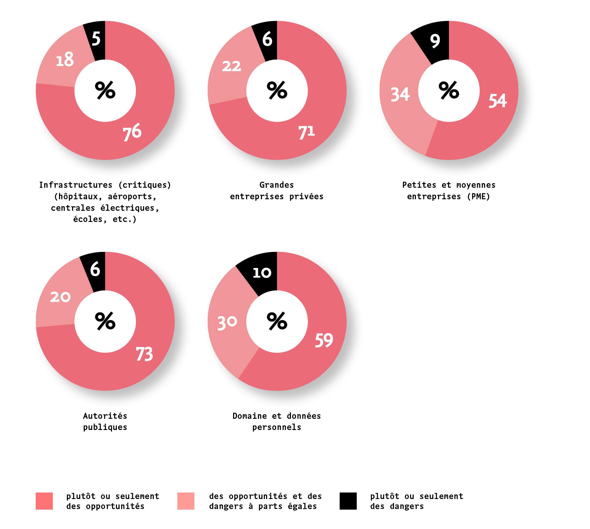 Du point de vue des personnes interrogées, le manque de cybersécurité représente un grand danger pour les infrastructures critiques (aéroports, centrales électriques, systèmes d'approvisionnement, écoles, etc. Il est possible qu'actuellement, la sensibilité aux dangers augmente encore plus en raison de la pénurie d'énergie actuelle et de la guerre en Ukraine. On peut supposer que notre dépendance vis-à-vis des infrastructures numériques et numérisées fait l'objet d'une prise de conscience accrue. Une étude montre que les grandes lacunes en matière de sécurité se retrouvent également ailleurs : Les secteurs de l'éducation et de la santé ainsi que l'administration sont particulièrement menacés (Dreamlab Technologies 2022).
